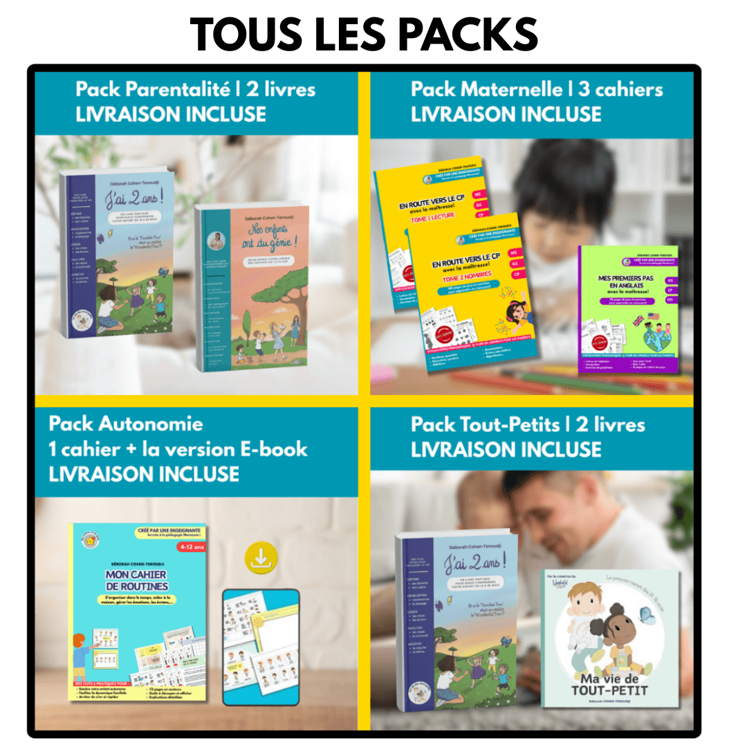 Des packs pensés pour offrir ou pour vous accompagner sur la durée, à prix doux. Ils contiennent certains de mes livres autour des grands enjeux de la parentalité et du développement de l’enfant.